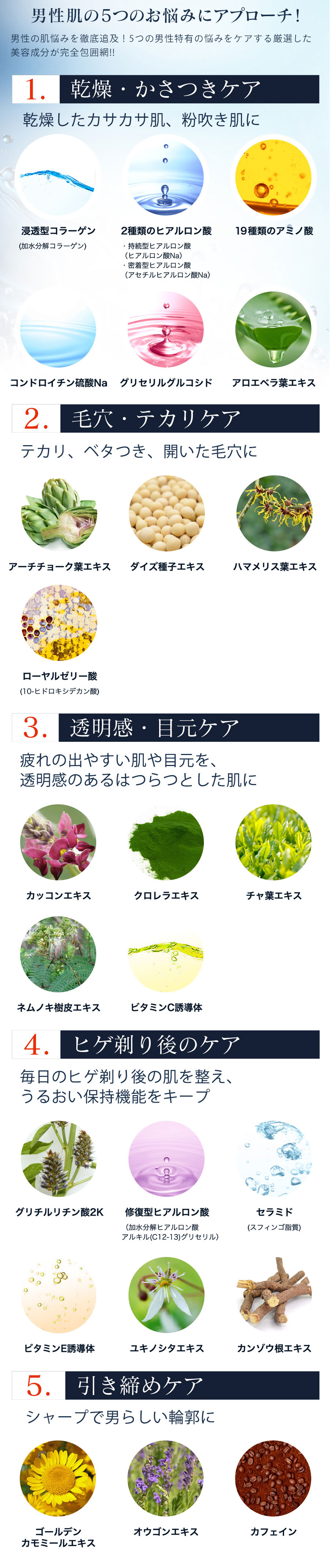 男性特有の5つの悩みに、充実の美容成分でアプローチ!