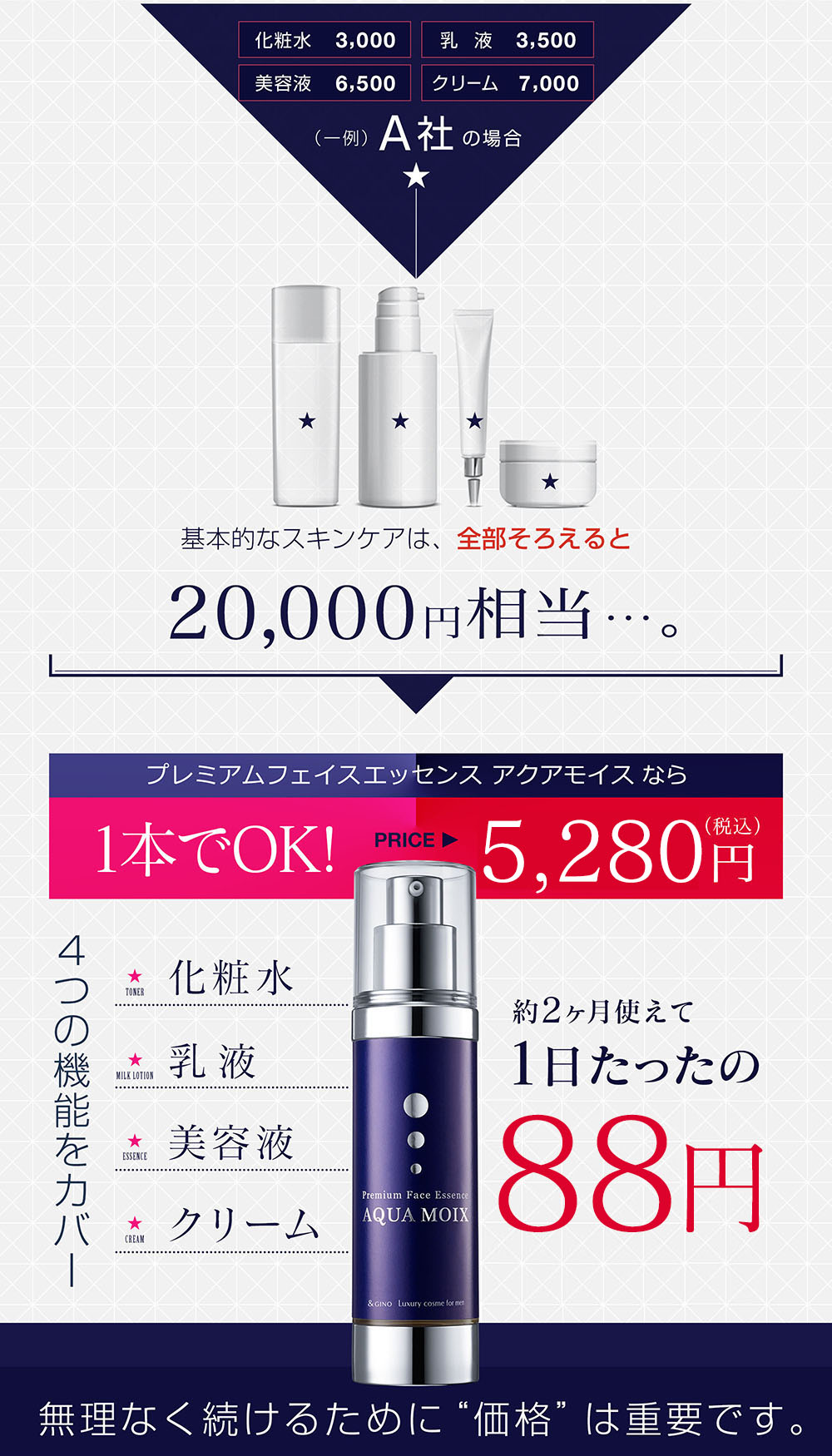 これ1本でOKだからコスパも良くて、基本的なスキンケアを全部揃える場合、化粧水・乳液・美容液・クリームなど、20,000円相当の出費ですが、アクアモイスなら1本5,280円なので、14,720円もお得!